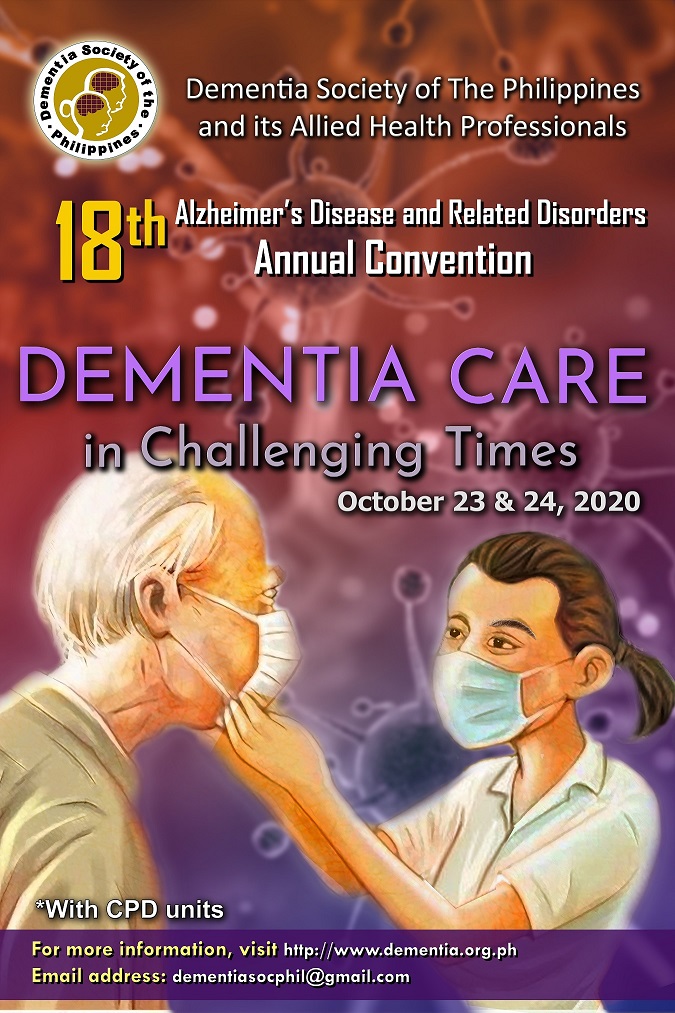 The Dementia Society of the Philippines and its Allied Health Professionals will hold its 18th Alzheimer’s Disease and Related Disorders Annual Convention ONLINE! It is scheduled on October 23-24, 2020 via ZOOM. Follow us on our Facebook by clicking this LINK for updates.