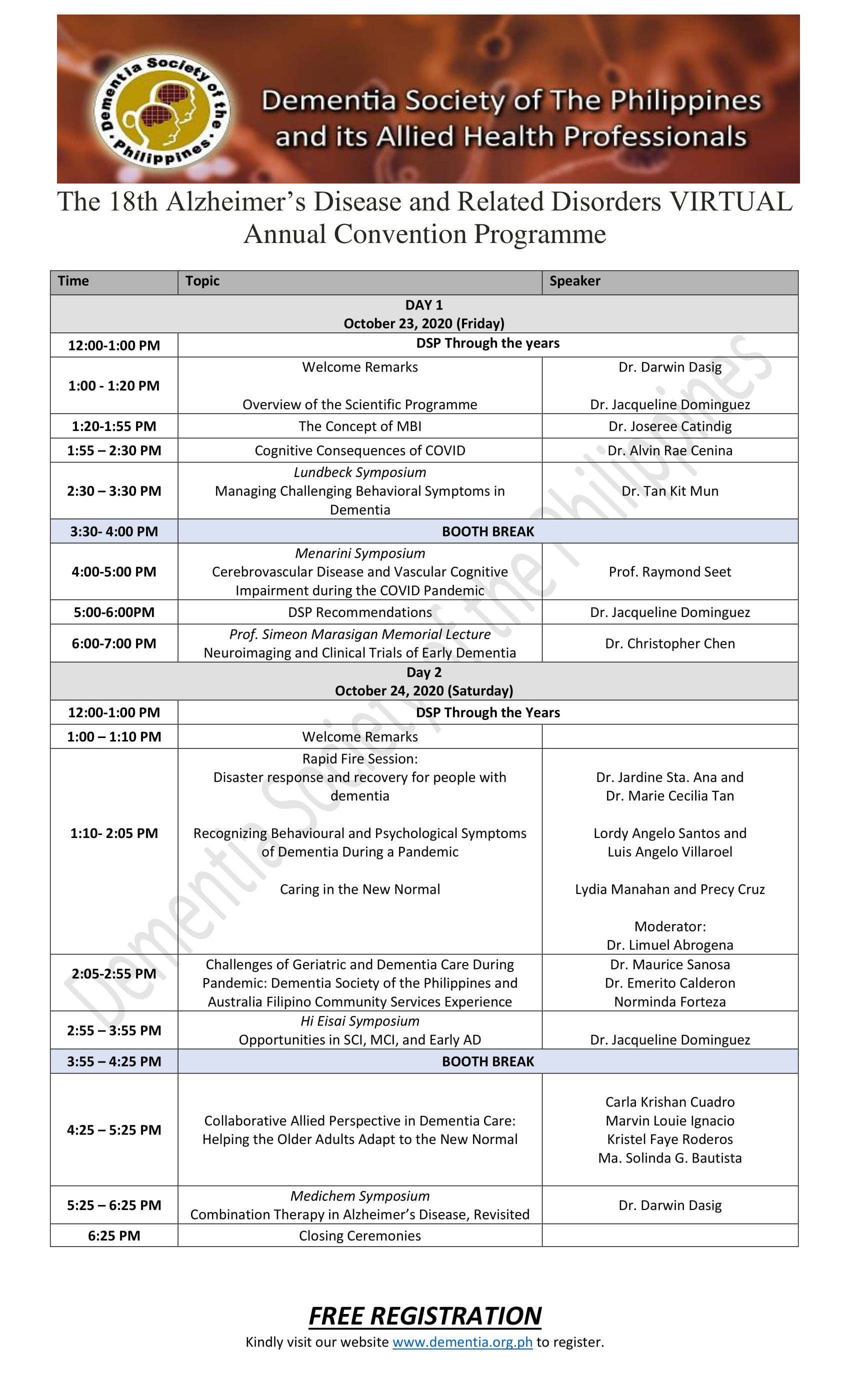 The Dementia Society of the Philippines and its Allied Health Professionals will hold its 18th Alzheimer’s Disease and Related Disorders Annual Convention ONLINE! It is scheduled on October 23-24, 2020 via ZOOM. Follow us on our Facebook by clicking this LINK for updates.